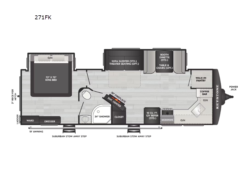 Come see all that this travel trailer has to offer! You will get a good night's rest each night on the 72" x 75" king bed slide, and your furry friend can sleep in there too with the built-in pet kennel storage underneath. There is even one of the dual entry doors to the unit, and an entrance into the dual entry bathroom which has a 34" radius shower to freshen up in every morning. Head to the front kitchen to brew a cup of coffee at the coffee bar then start frying up some eggs on the three burner cooktop and grab some oatmeal from the walk-in pantry. You can enjoy your meals at the booth dinette and then read the morning newspaper in comfort on the sofa sleeper across from the entertainment center with a 36" fireplace. The sofa sleeper can be switched out for optional theater seating, and the booth dinette can be switched out for the optional table and chairs!